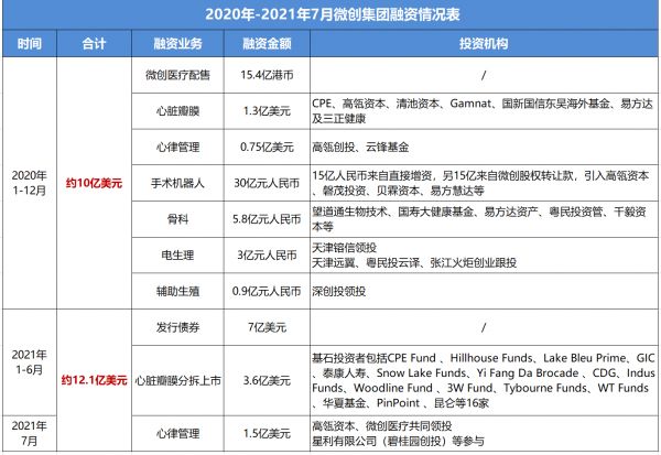 据公告,2020年微创集团累计融资10亿美元;2021年1-7月间,累计引入外部融资12.1亿美元,心律管理、微创脑科学等业务独立融资,显示出超强的吸金能力,获得CPE、高瓴、易方达等机构青睐。集团和各子公司融资后,又为外部并购创新公司提供资金支持。
