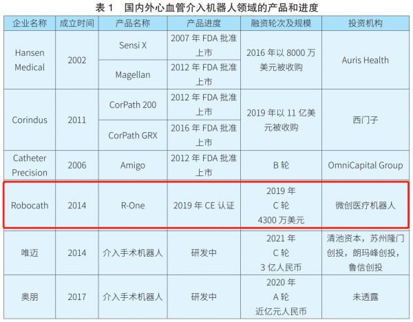 除了图迈、鸿鹄这两个最具看点的手术机器人,微创与法国公司Robocath合作成立了合资公司,引进血管介入机器人R-one(已在CE备案)。血管介入机器人直接应用场景包括冠脉PCI手术、神经介入、外周血管等,这些手术都需要在造影的条件下开展,临床医生需要“吃辐射”,使用机器人后,医生可以在导管室外精准操作,这成为可解决的痛点之一。