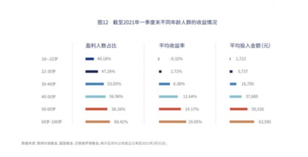 根据景顺长城基金、富国基金、交银施罗德基金三家基金管理公司携手中国证券报发布的《公募权益类基金投资者盈利洞察报告》,截至去年3月底,60岁以上投资者平均收益率达到19.05%,盈利人数占比达60.42%。而反观年轻人,30岁以下投资者平均收益率不到3%,盈利人数占比不到50%。