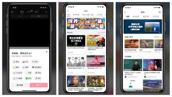 以产品设计的角度来看,抖音学习频道依旧强调算法的作用,上下滑动的竖屏浏览模式让用户的内容获取依赖平台算法,初次使用时会让用户选择兴趣标签,增加相关内容的推荐比例。快手和B站就不同了,在知识区内设有二级内容板块,如自然科学、设计创意和商业财经等,外加内容需要主动点击展开,用户的可选择度更高。下图由左到右,分别是抖音、B站和快手知识区的界面对比。
