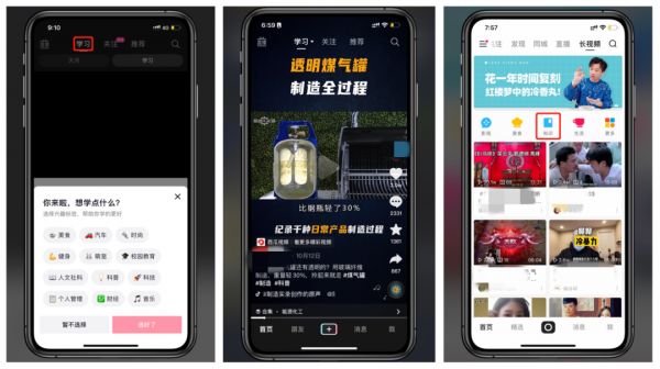 首先,可能是受平台功能过多的影响,无论是抖音还是快手,知识内容专区都藏得比较深,初次使用都需要好好研究一番功能的具体位置。抖音学习频道藏在首页的“同城”位置里,用户需要主动点击才能切换页面标签,将“同城”更改为“学习”,而快手的知识区打开路径为“精选-首页-长视频-知识”,同样不是很好找。