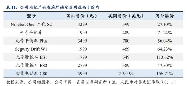 鉴于欧美市场良好的竞争格局,以及对产品价格敏感度较低,九号公司的智能消费产品在欧美拥有更大的溢价权。从历史售价来看,公司同款电动平衡车和滑板车在美国的售价相较国内平均溢价50%以上,如九号滑板车ES1定价549美元,相较国内售价1799元人民币溢价达到113.62%。