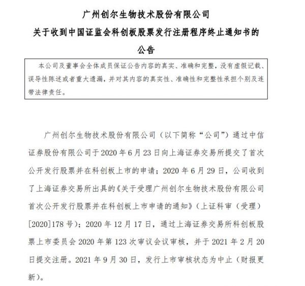 今年1月4日,创尔生物发布公告称,公司已于2021年12月31日,收到中国证券监督管理委员会出具的《中国证监会科创板股票发行注册程序终止通知书》,宣告公司冲击科创板彻底失败。