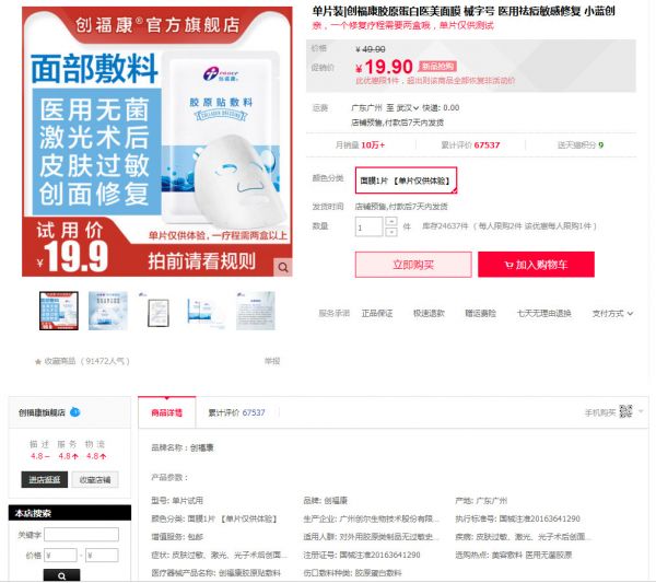 青眼注意到,创福康天猫旗舰店中曾在2019年月销售超10万件的胶原贴敷料,如今的月销售量也下滑至7万+件,并且,除了这一商品外,该店铺中其他商品的月销均未超过1万+,且不少产品的销量甚至不足100件。