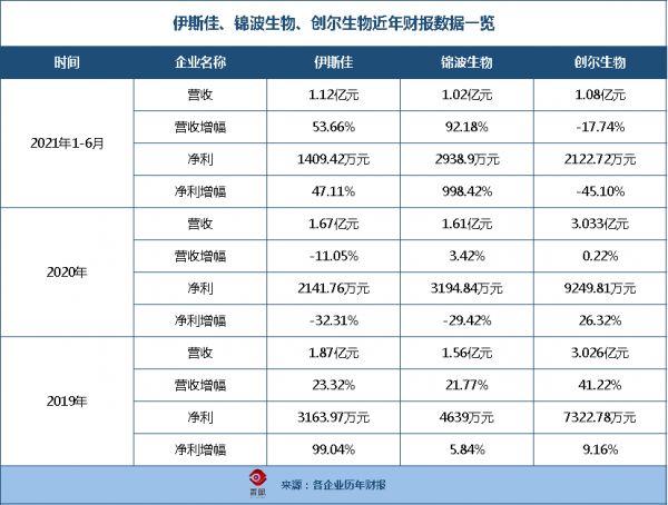 不过从全年的营收来看,在2019年和2020年中,创尔生物的营收和净利则远高于伊斯佳和锦波生物。而锦波生物则是3家企业中,唯一在2019年-2021年1-6月中,保持营收持续增长的企业。