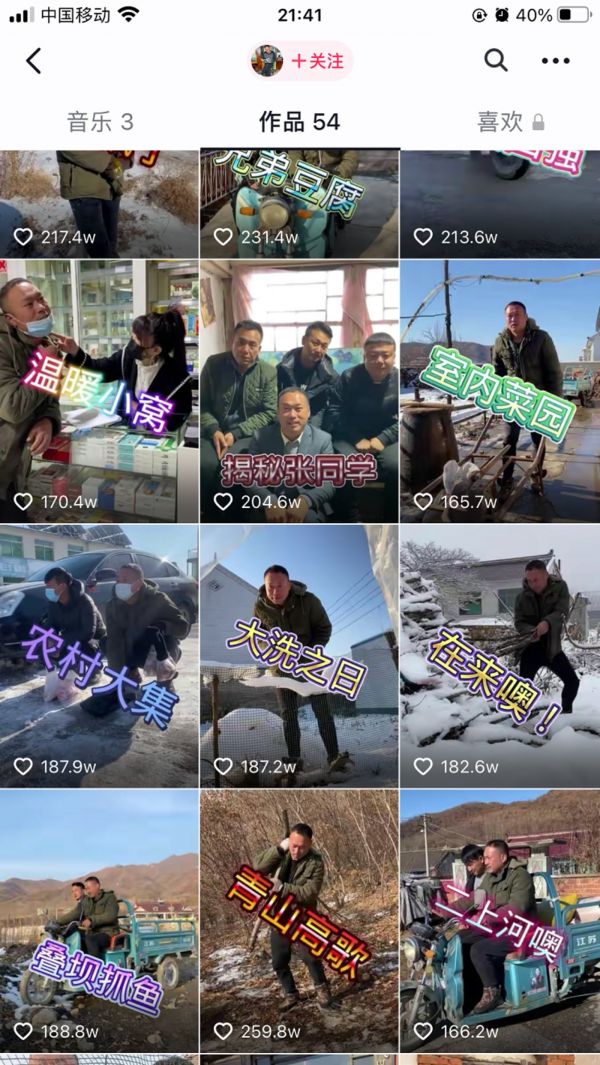 在过去两个月,一个专门拍摄拍摄农村情景剧的张同学,在抖音发布了48条视频,条均点赞90万,话题阅读量超62亿,吸引了1716万粉丝。花被子,热炕头,摸鱼喂鸡的日常记录让抖音网友们直呼“一天不看就浑身难受”。