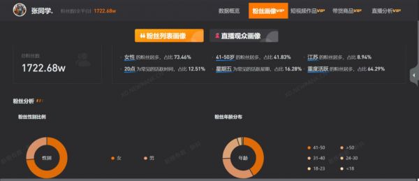 截止12月,通过新抖数据显示,张同学在短短2个月内,在抖音和头条全平台的粉丝数已达到1722.68万,发布了48个作品,点赞数已经达到了5962.24万。其中女性粉丝的占比达到了73.46%,粉丝年龄集中在41-50岁,整体占比达到了41.83%,其次年龄占比比较大的是>50岁和31-40岁的网友,占比分别是32.61%和20.68%。