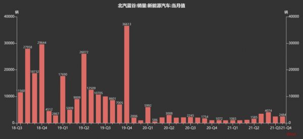 2019年新能源汽车全年销量达到15.06万辆,但2020年销量断崖式下跌83.27%,全年仅销售出2.59万辆。2021年前11个月北汽蓝谷新能源汽车累计销售21929辆,其中11月销售仅2471辆。
