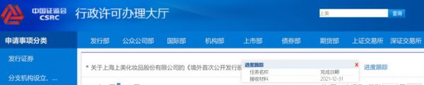 据中国证监会官网信息,“韩束”和“一叶子”母公司——上美集团,已向证监会提交境外上市申请,并于2021年12月31日完成接收材料任务。