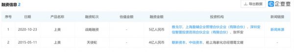 据企查查统计,上美集团仅有两次融资。第一次在2015年5月,天使轮融资4亿元,引入了联新资本和中信资本,还有前上海家化总经理葛文耀的个人投资。此次融资轰动一时,成为当时本土化妆品领域最大的融资案例。