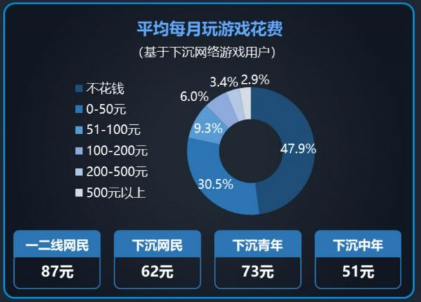 企鹅智酷统计的数据显示,下沉市场网民人均线上娱乐消费和一、二线成为网民差距并不大,其中,游戏是下沉市场用户线上消费的大头:下沉网民每月人均游戏消费为62元,青年用户更是高达73元,一、二线城市用户也才不过87元。
