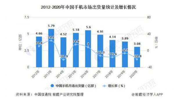 智能手机为代表的消费电子行业,则面临国内市场增长放缓的困局。前瞻产业研究院统计的数据显示,自2017年以来,国内智能手机市场出货量就一直处于负增长状态,2020年同比跌幅扩大至20.8%。