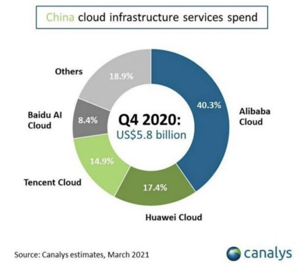 回顾过去三个季度,阿里云营收都保持稳定的同比增速,2021财年全年营收也超过了600亿。在营收持续增长的同时,阿里云的份额优势也变得更加不可撼动。根据Canalys的报告,截止2021年第一季度,阿里云在中国公有云市场占有率达到40%,几乎是腾讯云(11%)和华为云(11%)之和的两倍。就算将眼光放宽到全球市场,阿里云也仅落后于亚马逊、微软、谷歌,排名第四。