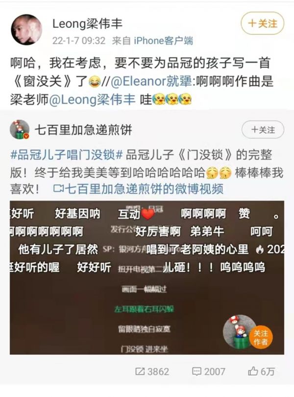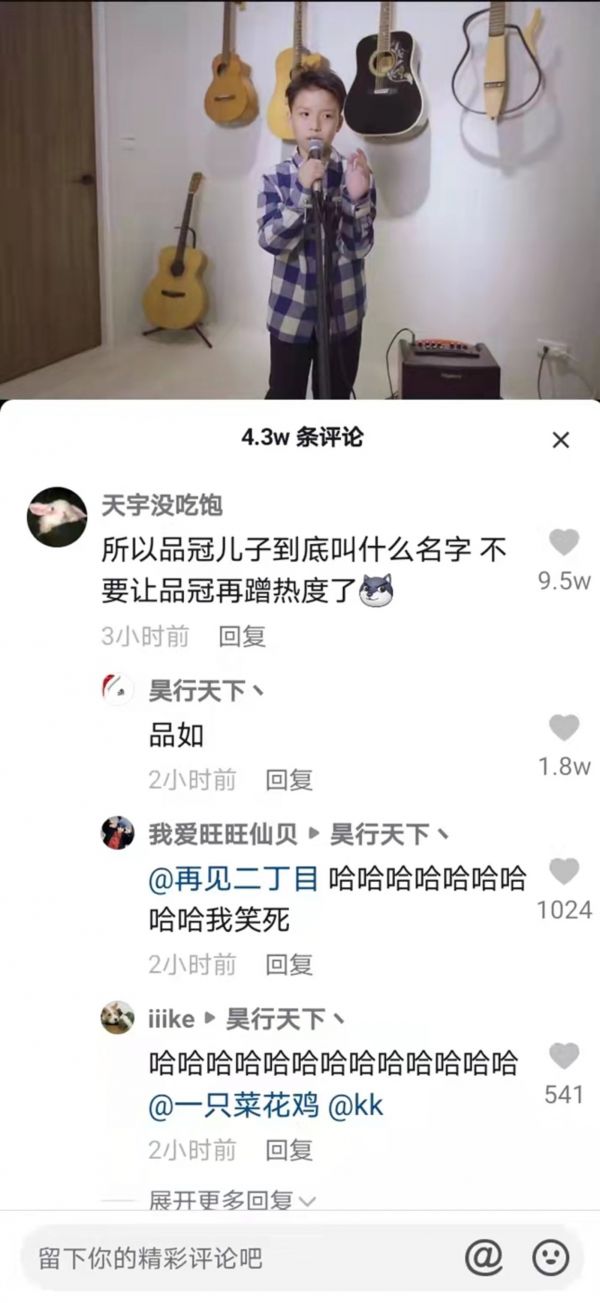 最常见就是在品冠的评论区劝他不要再蹭儿子热度,或是对他下一代唱歌天赋“门也没锁”表达羡慕。也有不明真相的吃瓜群众询问为什么品冠姓品而他儿子姓黄时,被要求思考一下“品冠有没有可能叫黄品冠呢”。