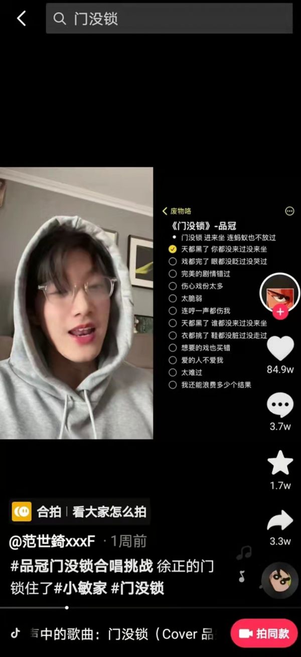 截至发稿前,品冠儿子翻唱版本的《门没锁》在抖音已被使用过41.8万次,这意味着短短两周,已有41.8万个作品带着这段音源在抖音传播,话题“门没锁”播放数据超过6.6亿。《门没锁》在快手的传播不及抖音,但作品数量同样高达11万。
