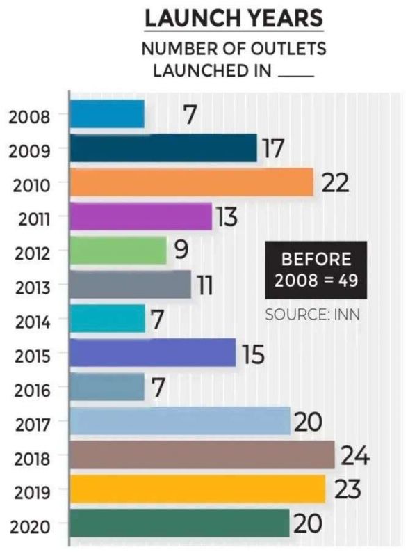 近几年,美国新闻界涌现出越来越多的非营利媒体,美国非营利新闻协会(Institute for Nonprofit News, INN)于2021年发布的最新数据显示,其两百多家会员机构大部分成立于近十年间,其中近1/3出现在近五年之内[2]。特别是疫情肆虐、商业媒体广告收入锐减的2020年,二十家非营利媒体涌现出来[3]。