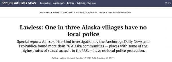 透过2020年赢得普利策公共新闻奖的一个项目,我们可以更深刻地理解这种合作关系。这组名为"无法无天"(Lawless)的新闻报道由非营利媒体ProPublica和阿拉斯加的本土新闻机构《安克拉治每日新闻》(The Anchorage Daily News)共同完成,揭露了阿拉斯加警察力量的严重不足,并由此引发的性虐待和家庭暴力频发、自杀率攀升等社会问题[9]。