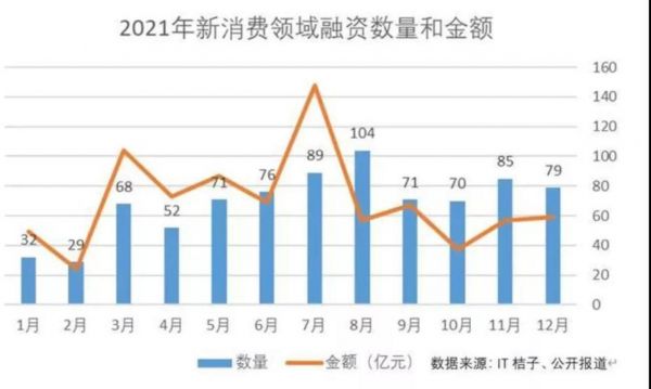 从融资数量和融资金额来看,2021年的7-8月是一道分水岭,继高峰之后,新消费的融资金额和融资数量都呈下降趋势。