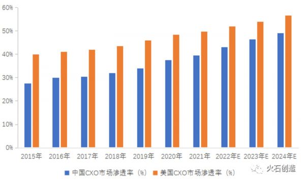 图2:2015-2024年中国与美国医药研发和生产外包服务市场渗透率(%) 来源:Frost & Sullivan