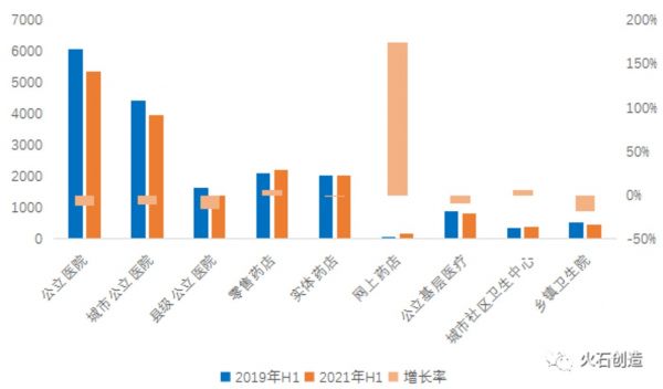 图5:疫情前后中国三大终端六大市场药品销售额情况 来源:火石创造整理
