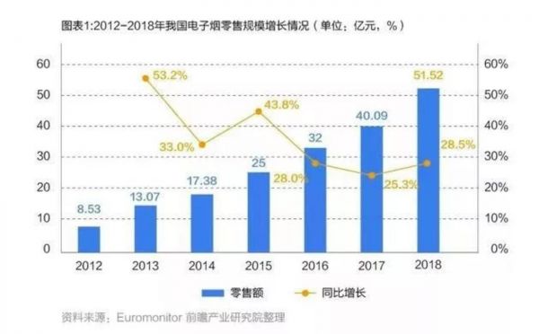 从市场前景来看,据中商产业研究院数据显示,中国的烟民数量远远超过美国,但电子烟的渗透率仅有1%左右,不及美国市场的1/12。而且过去6年里,国内电子烟零售规模同比增长率每年都超过了25%,发展潜力巨大。