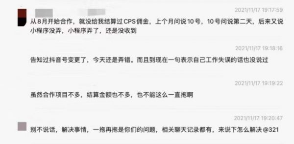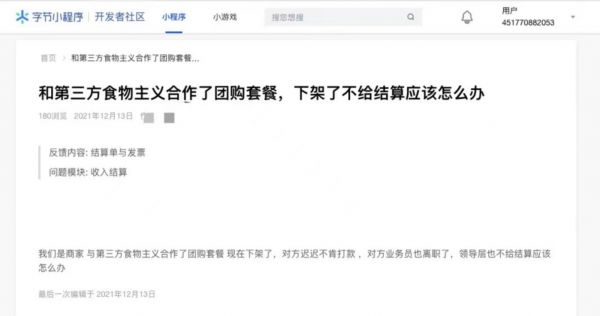 “后来我联系了抖音官方介入,才帮我要到钱。”这位达人说。在字节小程序上,也有达人投诉跟食物主义合作团购套餐后不结款的问题。