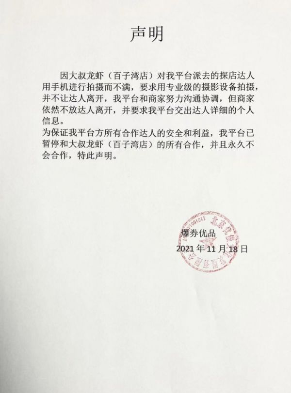 想办法离开后,小帆联系爆券优品解决,却得到平台的冷处理。一周后小帆联系了上百个探店达人,一起在抖音的官方群里抵制该平台,才最终得到了一封道歉信和1000元误工费。