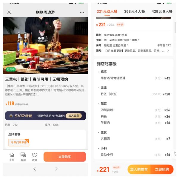 在当时,本地生活市场几乎已经被美团、大众点评、口碑等几大巨头占据,之所以能抢到用户,跟联联的“低价路线”有很大关系。同一家店的双人套餐,在美团上的售价是221,而在联联小程序上仅售118元。