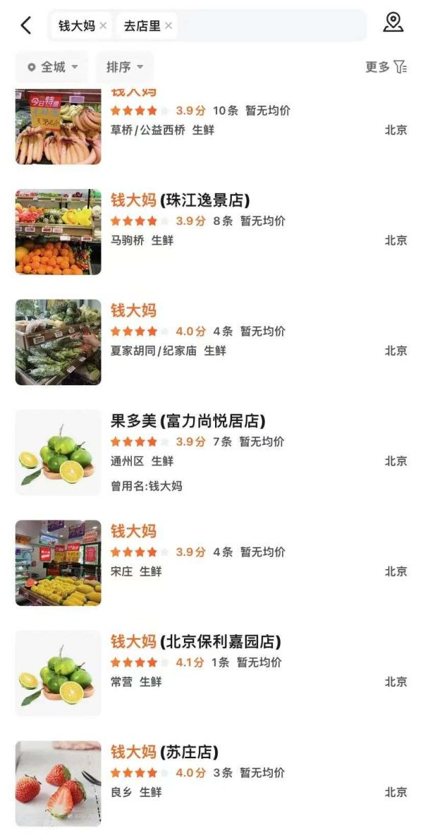 钱大妈北京门店情况,图源美团App截图