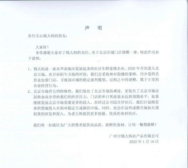 钱大妈针对北京市场闭店的声明,图源钱大妈官网