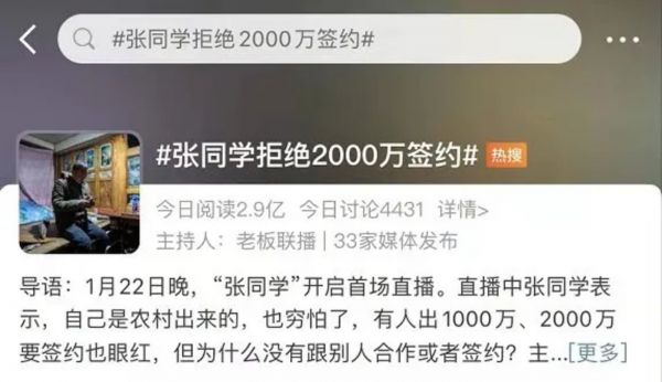 1月22日晚上,2000万左右的人涌进张同学的直播间,最高峰时,26.6万人同时围观着这位松树村男人的直播。