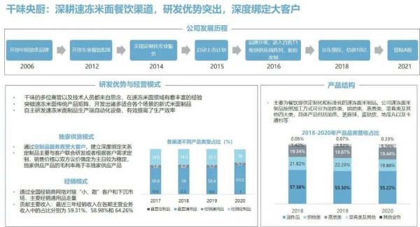 专业派的能量更是不容小觑。发力B端的千味央厨,深耕速冻米面餐饮渠道,研发优势突出,并不断突破速冻米面传统产品矩阵,开发出诸多适合各个场景的新式米面制品。通过定制服务直营大客户,以独家供货模式深度绑定大客户。通过全国经销商网络以通用品走量,肯德基的油条、真功夫的包子等都是其出品。