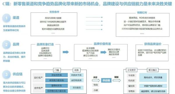 在C端,要始终洞察客户痛点,把握核心客群需求。目前,新零售渠道和竞争趋势品牌化带来新的市场机会,预制菜企业的决胜之局需要建设品牌与供应链的双重能力: