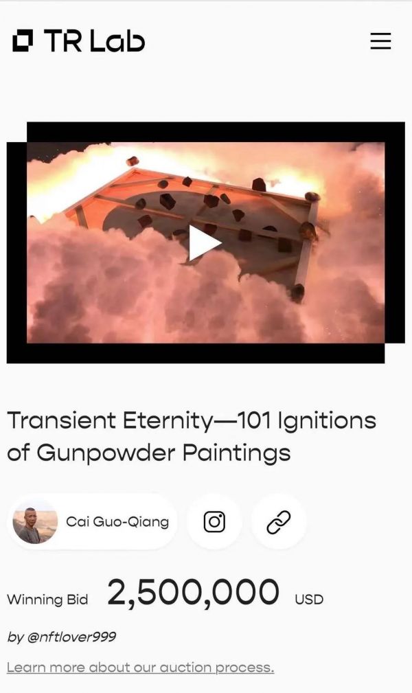 TRLab由联合创始人兼主席、佳士得全球非执行副主席李昕,以及联合创始人兼首席执行官欧晋翘所领导。自成立以来,TRLab与多位数字和传统艺术家进行了合作,推出了数十件1/1独版或限量版的NFT艺术品。蔡国强的首发NFT项目开始,更是以250万美元的金额创下2021年 NFT艺术交易的最高成交价格之一。