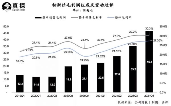 Q4,特斯拉实现毛利润为48.5亿美元,同比增长135%,毛利率达到为27.4%;其中整车销售业务实现的毛利润为46.5亿美元,整车销售毛利率为30.3%。