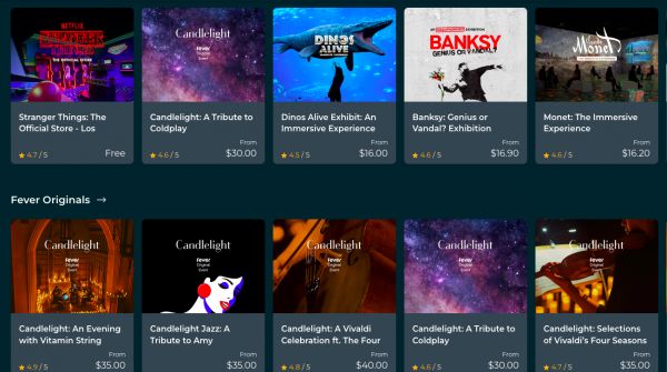 Fever是一个城市娱乐活动的集成式平台,功能类似于国内的“猫眼”或“大麦”,上面提供展览、演出、电影、音乐会、live表演、美食等一系列娱乐活动的信息、评分和购票服务,包括伦敦的沉浸式数字梵高展览,以及洛杉矶的Netflix系列剧 "Bridgerton"主题舞会等的独家门票。