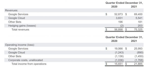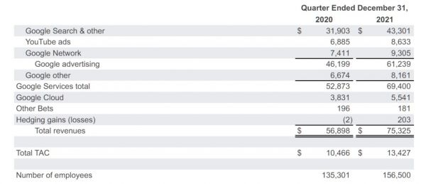 市场对谷歌收入的关注重点依然在于广告,核心是搜索广告。此前,针对科技股的下行趋势——比如奈飞令人大跌眼镜的财报指引,市场极度关心疫情等综合压力下巨头的表现,尤其是高增长基数的背景下。毕竟,一旦经济整体恢复形势不佳,广告主必定缩减开支预算。谷歌2021Q4总广告收入为612.4亿美元,比上年同期的462亿美元相比增长了33%,而搜索广告独占433亿美元,同比增长35%。