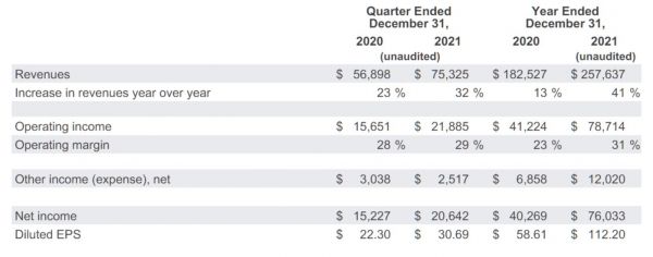 · 每股收益为30.69美元,与去年同期的22.3美元相比增长37.6%,高于华尔街分析师平均预期的27.34美元。