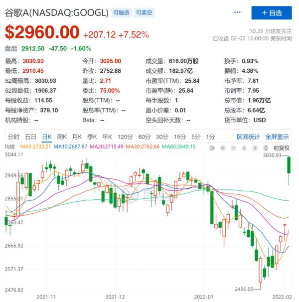 值得关注的是,谷歌宣布将在今年7月实行“1拆20”的拆股计划——单股股价将从近3000美元下将至150美元左右,此前股价过高的限制因素消除后,谷歌将迎来更多中小投资者的关注和交易,其市场表现有望继续攀升——在业绩稳健的基础上。受此影响,谷歌股价于2日盘后大涨超9%,并在2月3日再度以大涨7.52%收盘。截至发稿,谷歌股价为2960美元,市值1.96万亿美元。