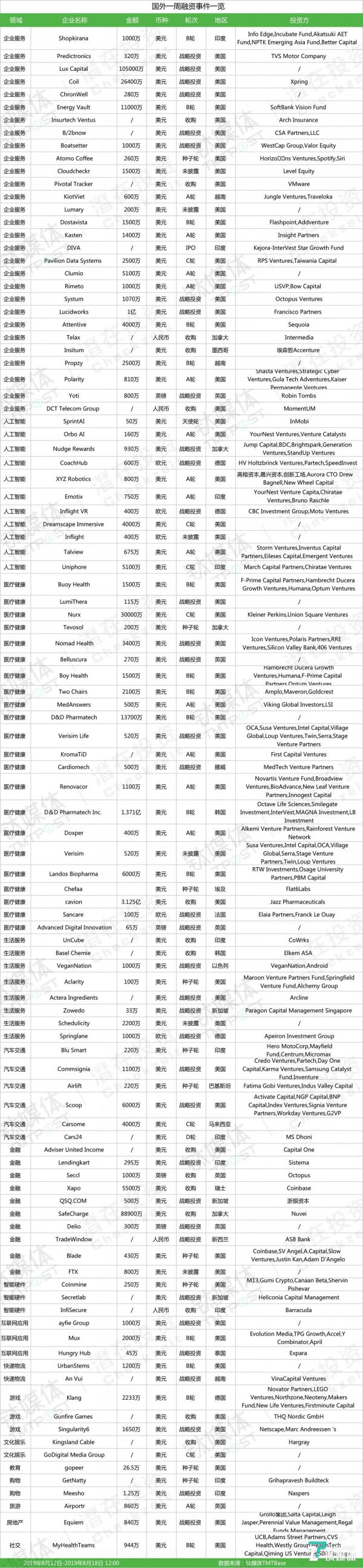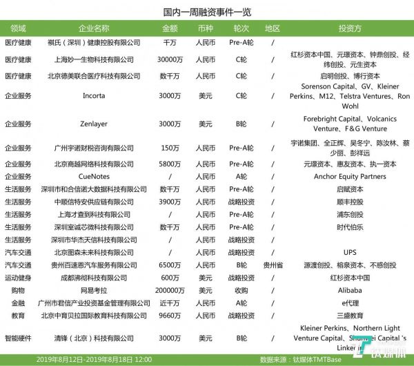 第34周收录134起投融资事件|国外企服、医疗健康投资继续领跑,国内有赶超国外趋势 | 潜在周报