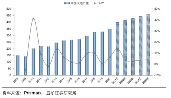 进入新世纪后的前十年,由于供给端进入者庞大,企业数量迅速增加,也就加剧了PCB行业的竞争程度,厂商利润被压缩,欧美日产能逐步向韩国、中国台湾、中国大陆等具有劳动力成本优势和产业链达标的亚洲国家和地区转移,这一时期PCB行业CAGR仅为2.1%。