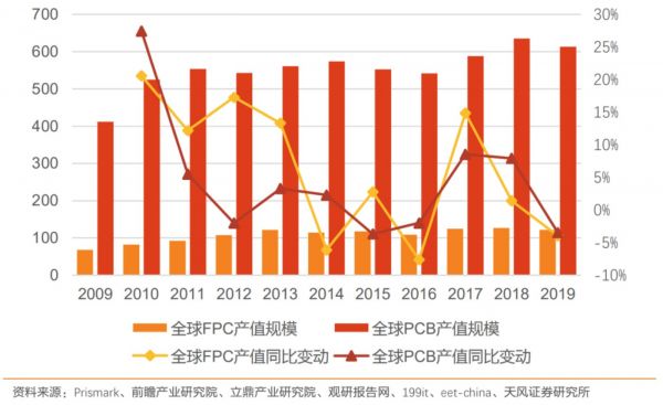 自2009-2019年,全球FPC产值复合增速为6%,高于4.1%的PCB整体行业增速,且目前已经占据约20%的PCB产值。