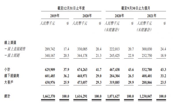 在线下渠道,从2019年、2020年至2021年9月,薇美姿的五大客户收入共占据了总收益28.8%、29.3%及24.3%。其中来自最大客户的收入分别占10.3%、9.7%及7.5%。可以看出五大客户的集中度,也呈逐年下降趋势。