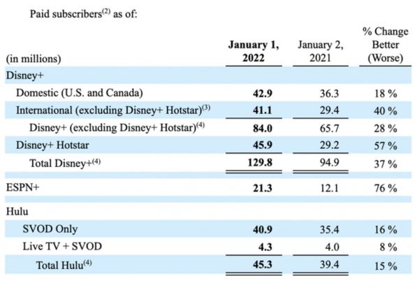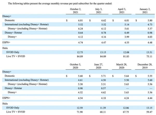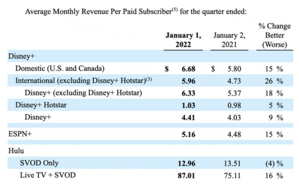 从财报来看,大幅增长来自其标志性的 Disney+ 流媒体服务,与 2021 年第四季度相比,该服务的净订阅用户数环比增长 1170 万。相比之下,分析师预期为 700 万,并将该公司的用户总数从 1.181 亿增加到 1.298 亿。不仅订阅者数量的增加,而且我们还经历了该平台上每个订阅者支付的平均价格的增加。该数字为每月 4.41 美元,高于上一季度的每月 4.08 美元和 4 美元。