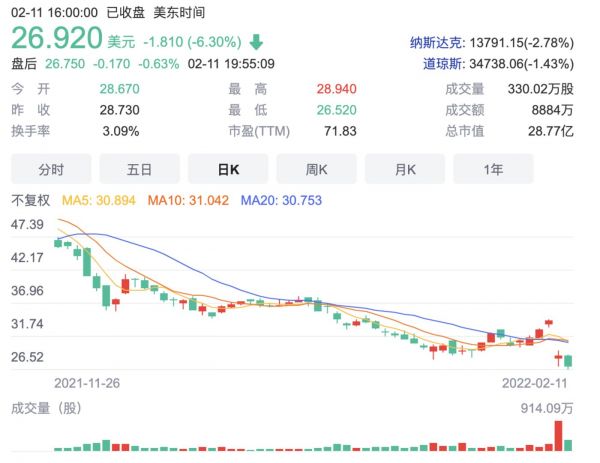 尽管第三季度的净销售额和收入持续增长,但在财报中,加拿大鹅下调了2022年财务指引,这显然低于华尔街预期。财报发布后,加拿大鹅股价从2月9日收盘价34.31美元跌至2月10日收盘价28.73美元,暴跌超16%,创下两年最大单日跌幅,而在本周五收盘,更是持续下跌至26.92美元。