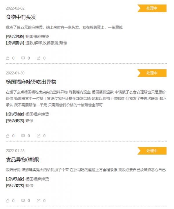 此外,在新浪黑猫投诉平台上,大量消费者投诉在杨国福麻辣烫就餐,吃到了头发、塑料、蟑螂等异物,甚至有消费者控诉杨国福麻辣烫害自己吃出了肠胃炎。