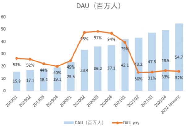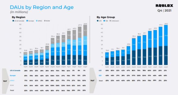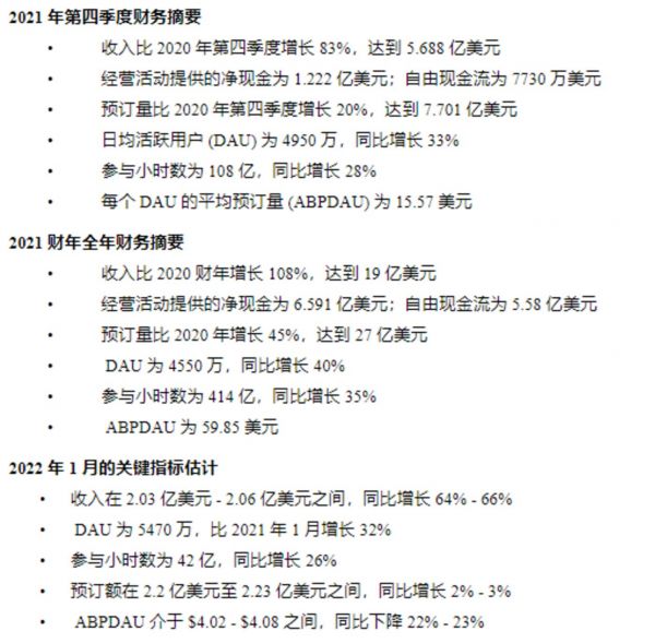 对于2021年,Roblox收入比2020财年增长108%,达到19亿美元;预订量同比增长45%,达到27亿美元;DAU为4550万,同比增长40%。