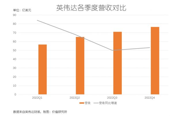 同比上一财年,英伟达四季度营收增幅为53%,整个2022财年的营收同比增幅更是高达61%。从环比的角度看,英伟达2022财年前三个季度的营收分别为56.6亿、65.1亿和71亿美元,对应的同比增速为84%、68%和50%。对比来看,英伟达四季度营收达到全年峰值,同比增速也较三季度进一步回升,显示了强大的后劲。
