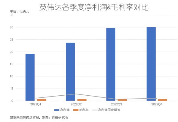 回顾英伟达过去几个季度的财报,价值研究所留意到,其净利润的同比增速比营收更加恐怖。2022财年前三个季度,其净利润分别录得19.1亿、23.7亿和29.7亿美元,同比分别增长109%、282%和62%。除了三季度稍微逊色之外,过去一年英伟达基本都能实现净利润的同比翻倍,吸金能力相当惊人。