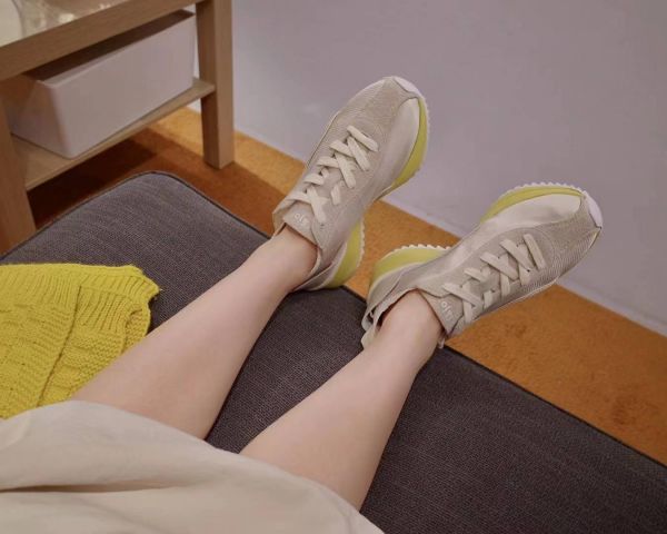 具体来看,冰淇淋丝绸鞋在外形上参考了传统慢跑鞋——类似“阿甘鞋”的鞋型,但改变了传统跑鞋的结构,让用户“光脚穿更自由”,其特点是加入了丝绸材质,从视觉上带给用户一种舒适的感觉;同时内里嵌有袜套结构,选用凉感纱材质,光脚穿时会有明显的“凉”与“速干”的体验。而fufu丝绸鞋在包裹性和穿着感上会更好一些,色彩搭配偏中性一些,应对的穿着场景也更多一些。
